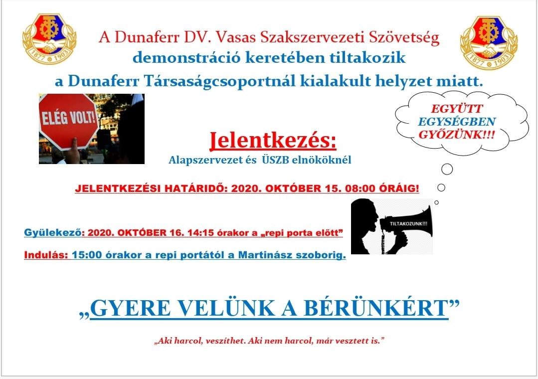 A Dunaferrnél kialakult helyzet tovább súlyosbodott. A cég a szeptemberi béreket csak részben fizette ki a dolgozóknak a törvényes határidőig. 2020. október 10-éig a munkavállalók 200.000,-Ft nettó bért kaptak meg, a maradék kifizetését október 22-éig ígérik átutalni. A kollektív szerződésből fakadó további juttatások (így pl. a nyugdíjpénztári és egészségpénztári befizetések) megfizetését pedig akkorra ígéri a vállalat, amikor azt a pénzügyi lehetőségei megengedik. Ezért demonstrációt hirdetünk október 14-én délután 16 és 17 óra között az Orosz Föderáció Nagykövetsége elé (1062 Budapest, Bajza utca 35.) Követeljük a bérek, juttatások azonnali kifizetését! Kérjük, hogy a tüntetésen történő részvételetekkel biztosítsátok támogatásotokról, szolidaritásotokról az ISD Dunaferr dolgozóit, az ottani Vasas tagokat! Emellett helyi kollégáink köszönettel várják szolidaritási üzeneteiteket is a következő email-címre: babel.b@vasasok.hu